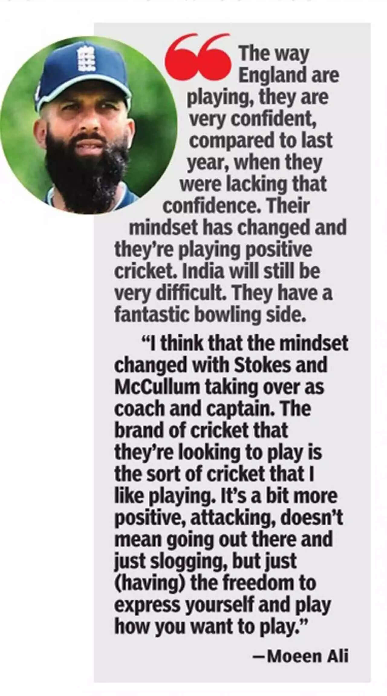 "Last year, India had four games under their belt. This time they've had a practice game and some net sessions. At the moment, England, in my opinion, are the favourites, because they've just played three good Tests, and the way they are playing, they are very confident compared to last year. Their mindset has changed and they're playing positive cricket. India will still be very difficult. They've a fantastic bowling side," Moeen said.
