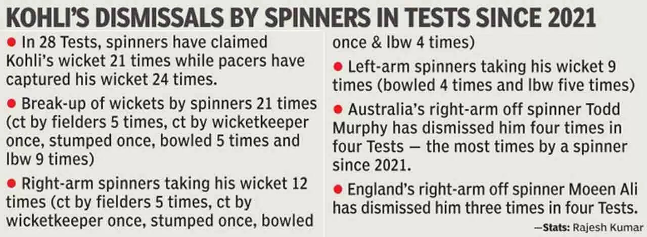 BENGALURU: The noise surrounding Virat Kohli's struggle against spin has been mounting, only getting shriller as his ordinary numbers against tweakers has burgeoned. In the past 28 Test matches, Kohli has been dismissed by spinners on 21 occasions, with off-spinners doing the bulk of the damage.