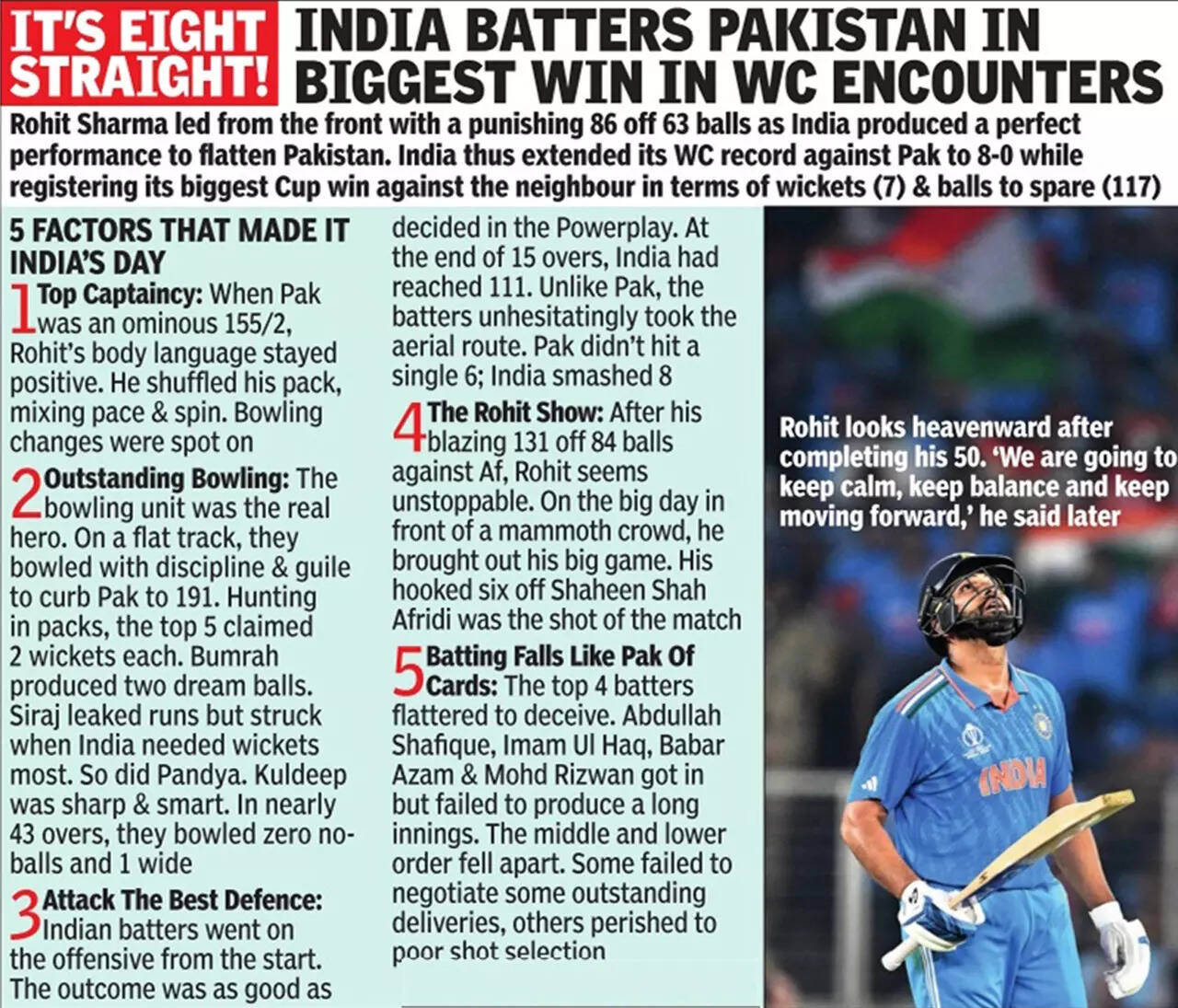 With three wins out of three and an NRR of +1.821, India now sit on top of the table and have a four-day break before they take on Bangladesh in Pune on the 19th. Pakistan travel to Bengaluru to face Australia on the 20th. Along with the hurt of losing tamely to their arch rivals again, they will also be carrying worries over the lack of potency in their bowling attack, something that India worried about for several years.