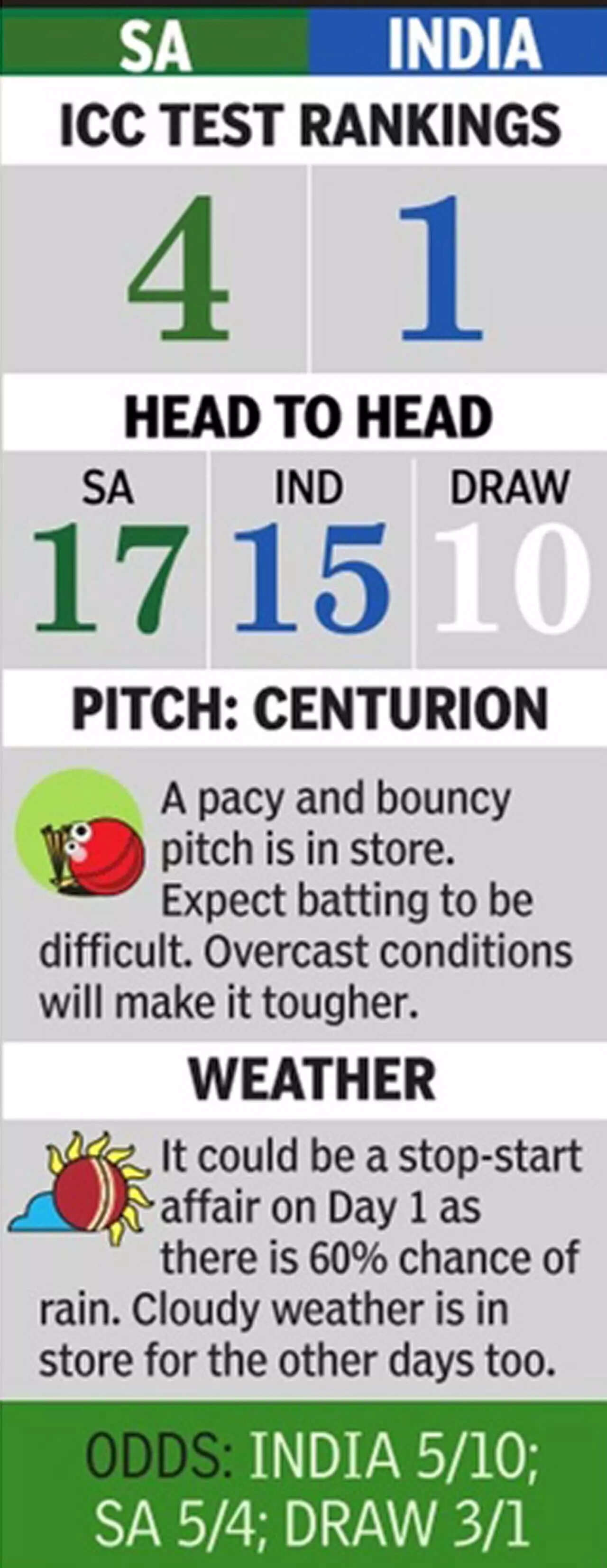 Who needs 450 overs or full five days of play to get a decisive result in a Test match? Both hosts South Africa and Rohit Sharma's India would like to think that way as rain is expected to either halt or wash out multiple sessions in the first match of the two-Test 'Friendship Series' at SuperSport Park in Centurion from Tuesday.