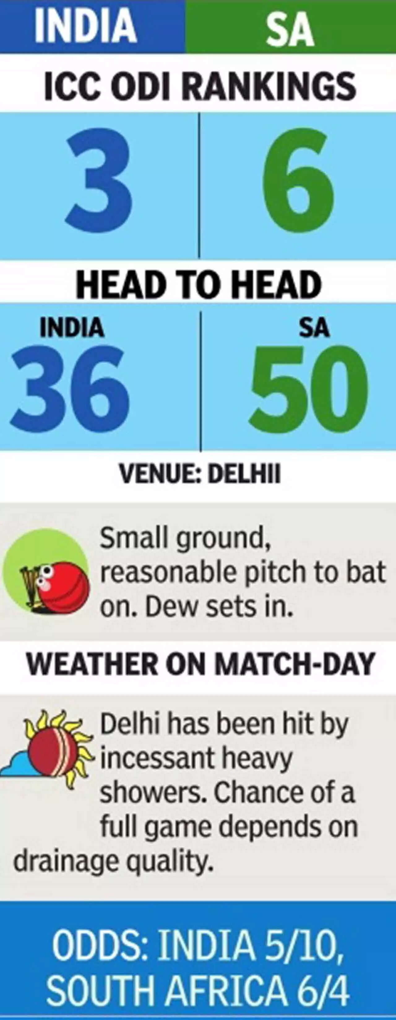 The Kotla pitch has historically been low and slow. Over the last few years, it has produced big scores in the IPL. South Africa comfortably chased down 211 here in a T20I this June. But the pitch has been under covers for four days. Monday was the first time the curator could see the pitch in three days. There's bound to be sweating and a lot of moisture.