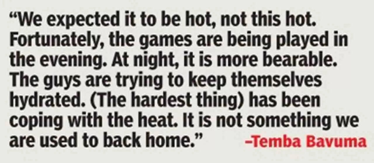 "We expected it to be hot, not this hot. Fortunately, the games are being played in the evening. At night, it is more bearable. The guys are trying to keep themselves hydrated. Keeping themselves as mentally fresh as they can," South Africa skipper Temba Bavuma said.