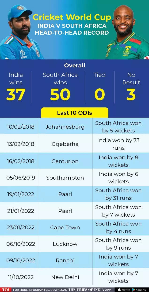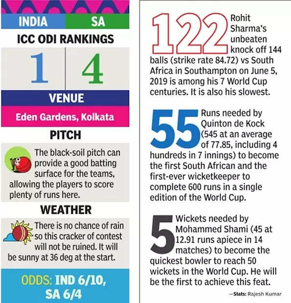 NEW DELHI: It's a battle between two most consistent teams of this ICC World Cup today at the Eden Gardens in Kolkata. India are yet to be beaten after seven matches, and South Africa have lost just once in seven matches. As a result, both have qualified for the semi-finals, but the contest for the top spot in the table is very much on.