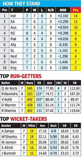 The South African batters have been plundering runs throughout the tournament, led by Quinton de Kock, who is the highest run-getter currently with 545 runs in seven matches, including four centuries. But the Indian bowlers, especially the pace trio of Jasprit Bumrah, Mohammed Shami and Mohammed Siraj, are on song and have taken the most wickets among all teams in the tournament so far.