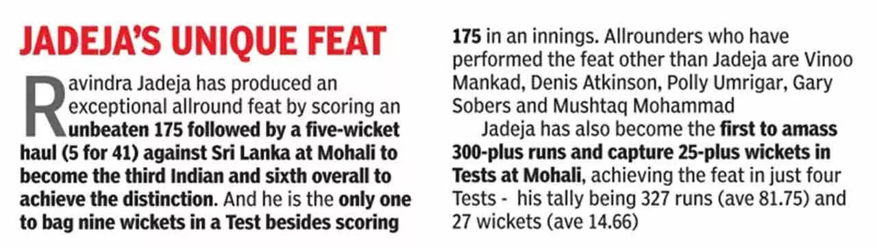 Yet, when India wrapped up the first Test against Sri Lanka, winning the match by an innings and 222 runs, the man who imposed himself on the game was Ravindra Jadeja. His match figures of 9/87 and his unbeaten 175 the previous day were the driving force behind India completing the rout in three days.