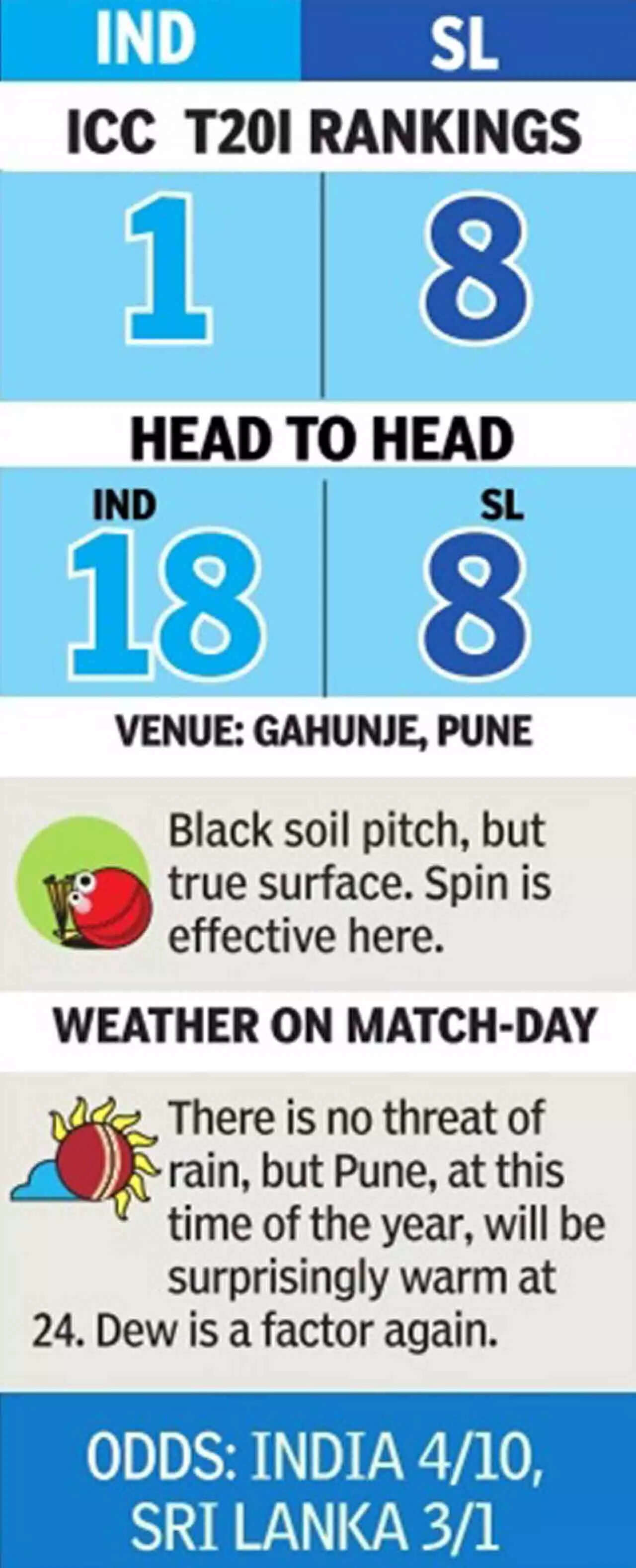 Although he averages 16. 87 in nine T20Is, Gaikwad's candidature is backed by six hundreds in domestic white-ball cricket recently. Also, his experience of playing at the Gahunje ground could be a thing of discussion. With Samson already out, Hardik Pandya and coach Rahul Dravid will not look to make further changes to their batting line-up, despite opener Shubman Gill having a forgettable debut at Wankhede.