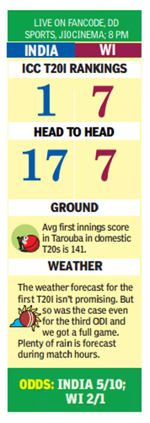 NEW DELHI: India will again start as overwhelming favourites against the West Indies in a five-match rubber starting at Tarouba in Trinidad from Thursday, less than 48 hours after their ODI series triumph.