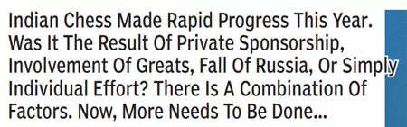Though chess has always been a high priority sport in the government files because of India’s success in global age-group events, the positive effect of private sponsorship and involvement of absolute greats in the development programme (Westbridge Anand Chess Academy) have given real dividends only now. The Lightning Kid (Anand) has played a big role in making India’s progress electric.