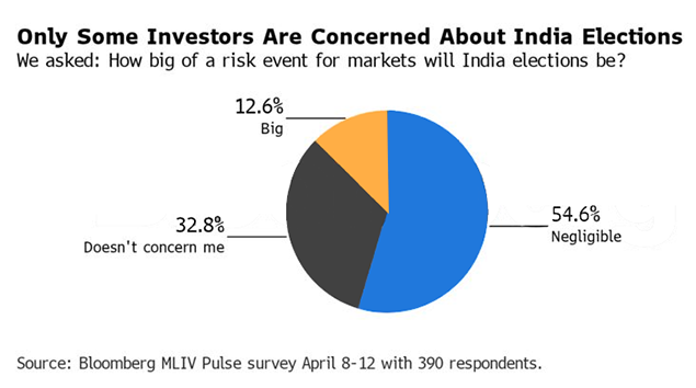 PM Modi’s party faces a national election this year, and he has made India’s accelerating economy a major part of his pitch. He is expected to return as prime minister with a strong majority to deepen infrastructure investment and manufacturing. Should he lose, it may derail the infrastructure and manufacturing push. Investors don't seem concerned though, with more than four-fifths of respondents saying the impact of the elections on markets would be negligible or doesn’t concern them.