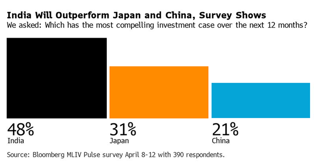 India’s ability to turn its economic expansion into corporate profits makes it a better prospect for investors than Japan or China, according to the latest Bloomberg Markets Live Pulse survey.