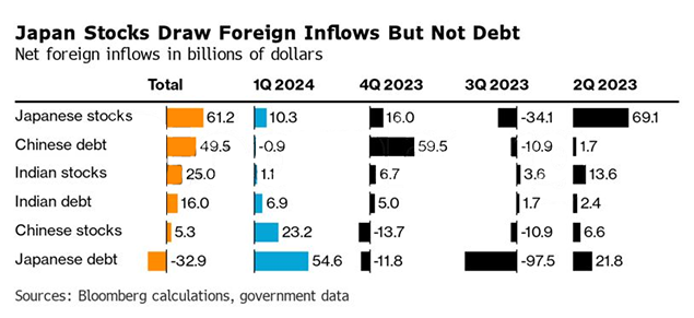 Key stock indexes in both India and Japan have climbed to records this year following a rally driven by rapid economic growth in the case of India, and the gradual return of inflation, along with corporate reforms in Japan. Indian equities now trade at around 23 times next year’s expected earnings, exceeding even the US, and outpacing the 17 for Japan and about nine for China, according to data compiled by Bloomberg based on MSCI Inc.’s indexes.