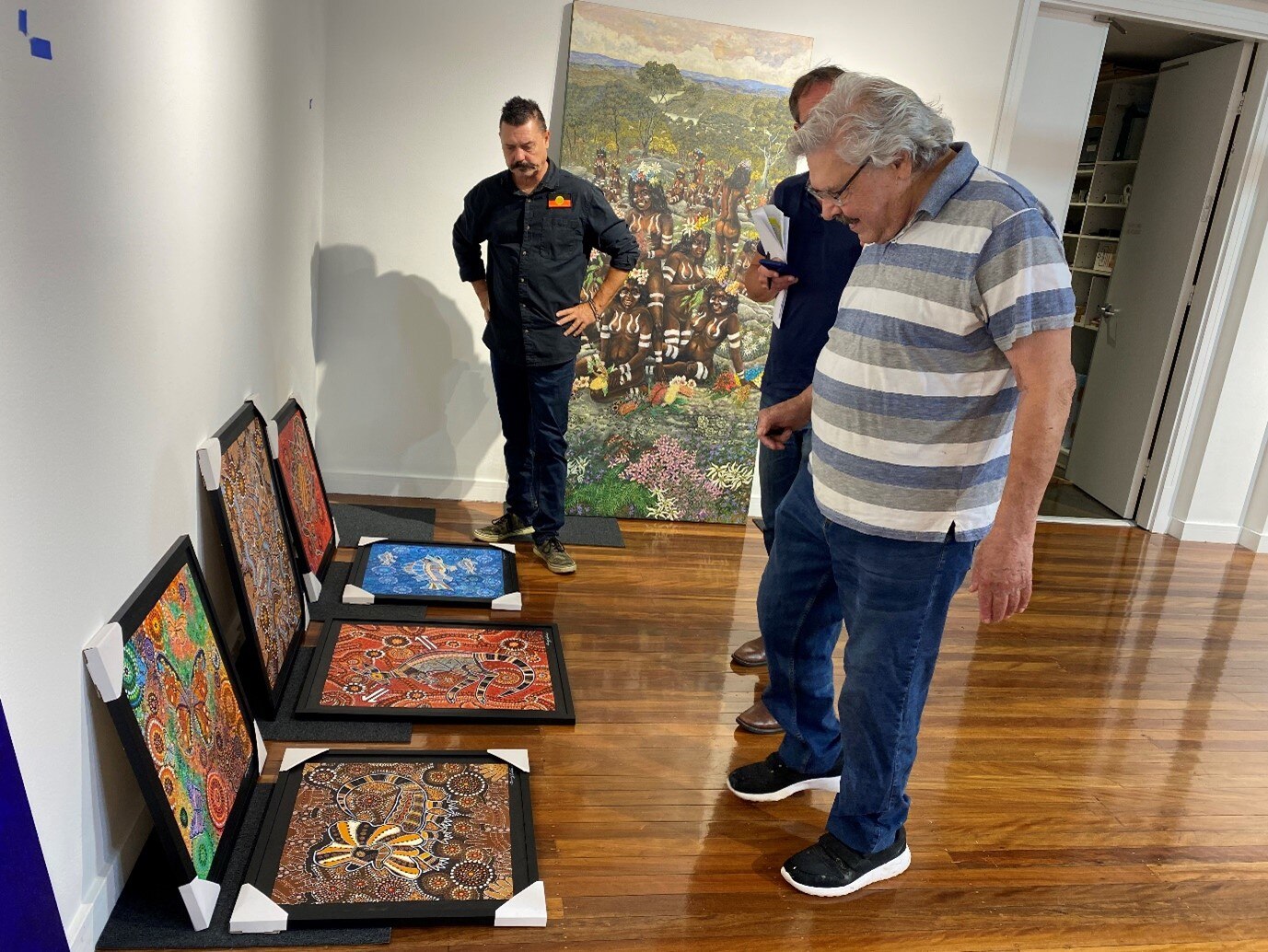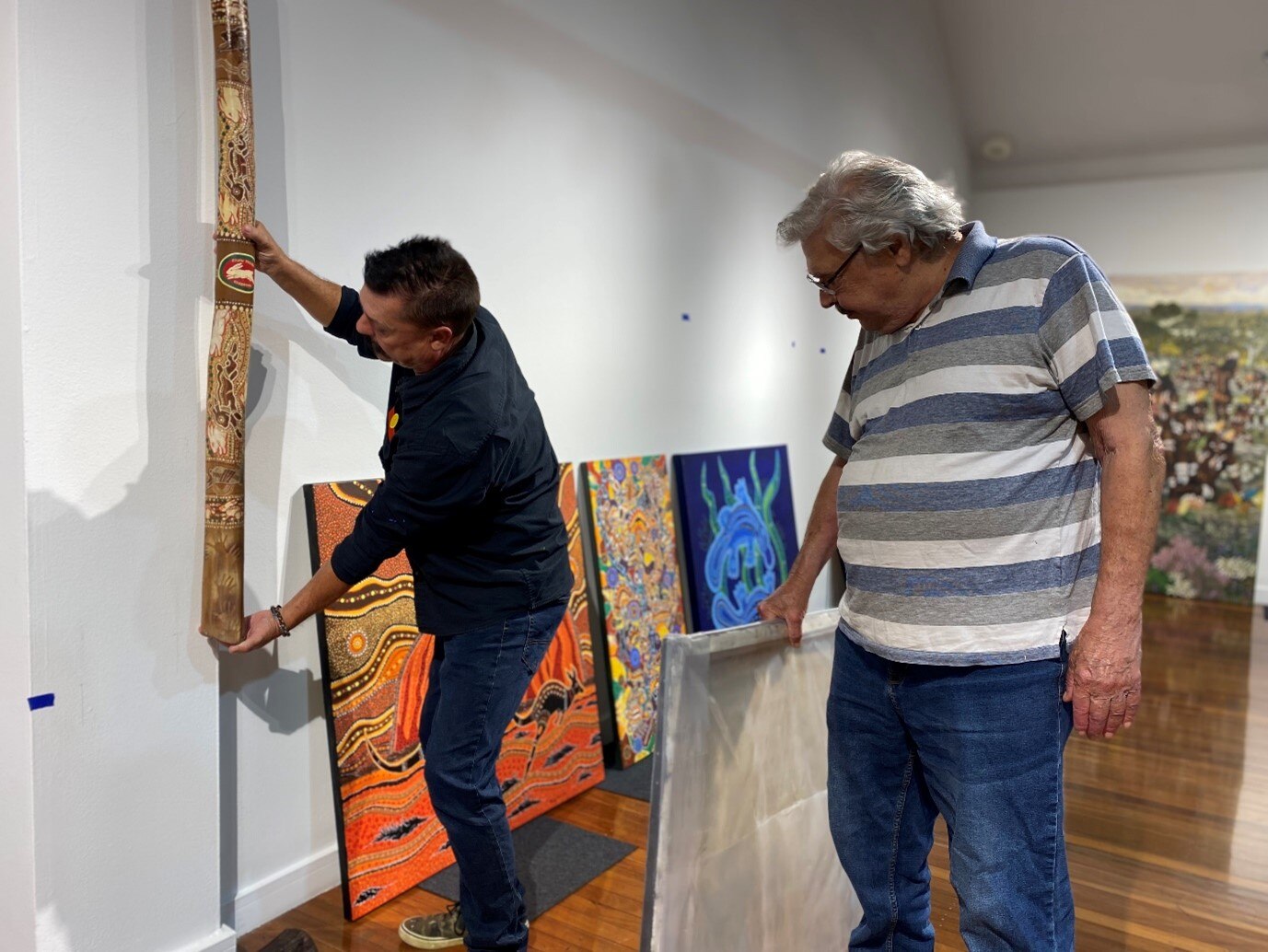 Uncle Danny with his son Jamie Eastwood preparing for his exhibition at Blacktown Arts Centre. (ABC News: Nakari Thorpe )