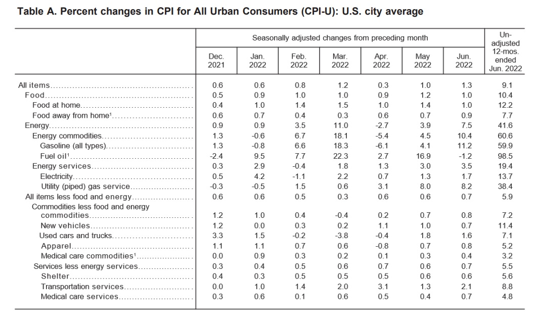 Department of Labor data released Wednesday morning showed that inflation picked up speed in June, rather than slowing. Prices rose by 1.3 percent during the month, up from a 1 percent increase in May. A sharp rise in energy prices, and gasoline prices particularly, helped power the annualized inflation rate to its highest levels in more than four decades. Food prices rose by 1 percent during June, and are up 10.4 percent over the past year.