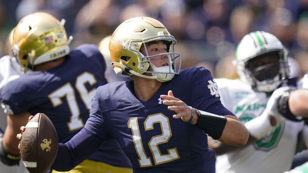Fighting Irish coach Marcus Freeman said Monday that Buchner has a severe AC joint sprain in his left shoulder. Buchner was injured in the fourth quarter of Notre Dame’s surprising loss to Marshall over the weekend and was scheduled to have surgery Tuesday.