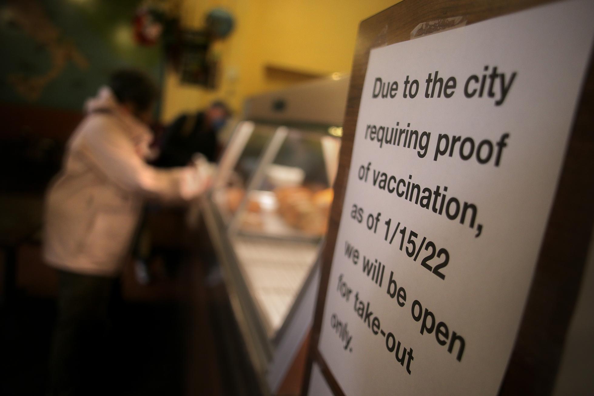 A customer picks up a take-out order near a sign noting Boston's proof of vaccination on Jan. 13. Boston Globe via Getty Images