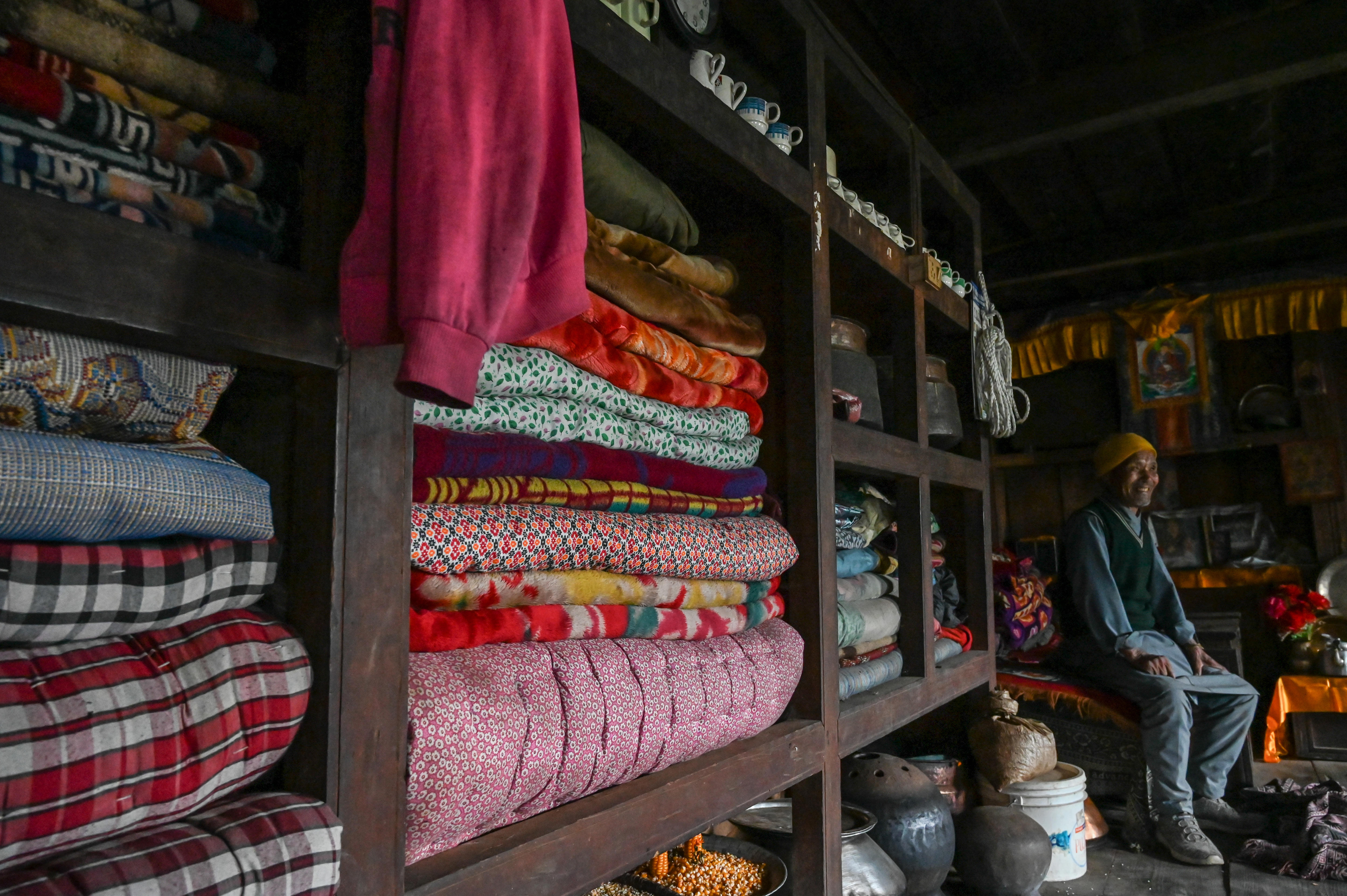 Ngawang Chhepal pours tea into two cups and places them on one of the wooden tables that line his greeting room. In Sherpa culture, it is customary to welcome people with tea or local wine. The cups used must be un-chipped or it is considered an insult and bad luck.
