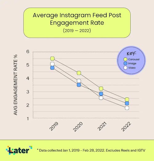 It’s not just that your content isn’t good — Instagram engagement is down across the board. Overall engagement on the app has decreased about 44 percent since 2019, according to a new study by social media company, Later, which analyzed approximately 81 million Instagram posts made between January 2019 and February 2022.