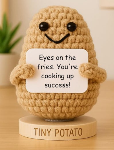 Is it a tiny potato? Is it a mood-lifting cheerleader? This hilarious plushy does it all—complete with sweet crocheted vibes and an uplifting affirmation tag that basically says, 'You’ve got this.' It’s the perfect lil’ desk pal for when life gets heavy, or you just want to feel encouraged by a potato. Scoop one up for instant smiles, guaranteed.