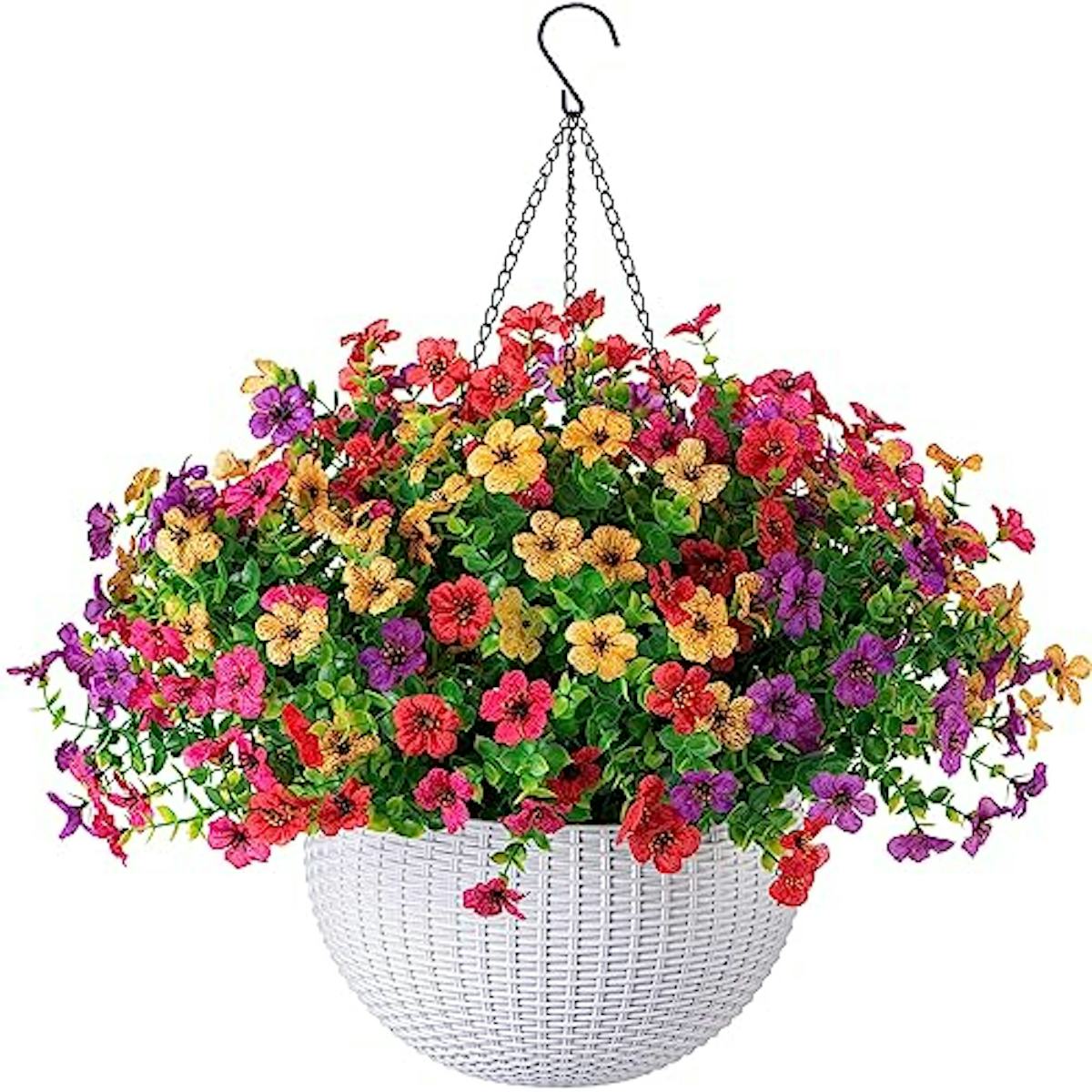 HyeFlora Artificial Faux Hanging Plants Flowers Basket for Outdoor Outside Spring Summer Decoration, Fake Silk UV Sun Resistant Realistic Colorful Daisy for Porch Patio Balcony Home