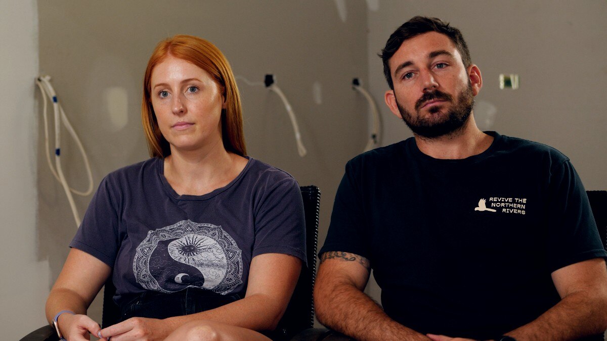 Almost 12 months after the February 28 flood, Lismore residents Lennon Allen-Bartlett and his partner Sophie Adams are still living in a caravan after their home was inundated to the ceiling.