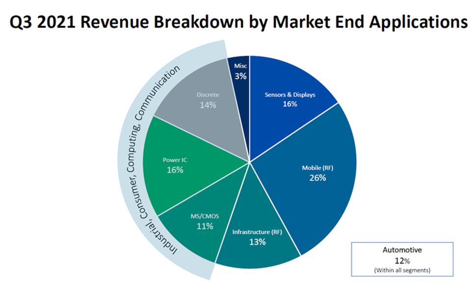 Intel and Tower Semiconductor have very different markets. Tower Semiconductor’s business and capabilities to IFS becomes clearer when you look at the Q3 2021 breakdown of its markets: