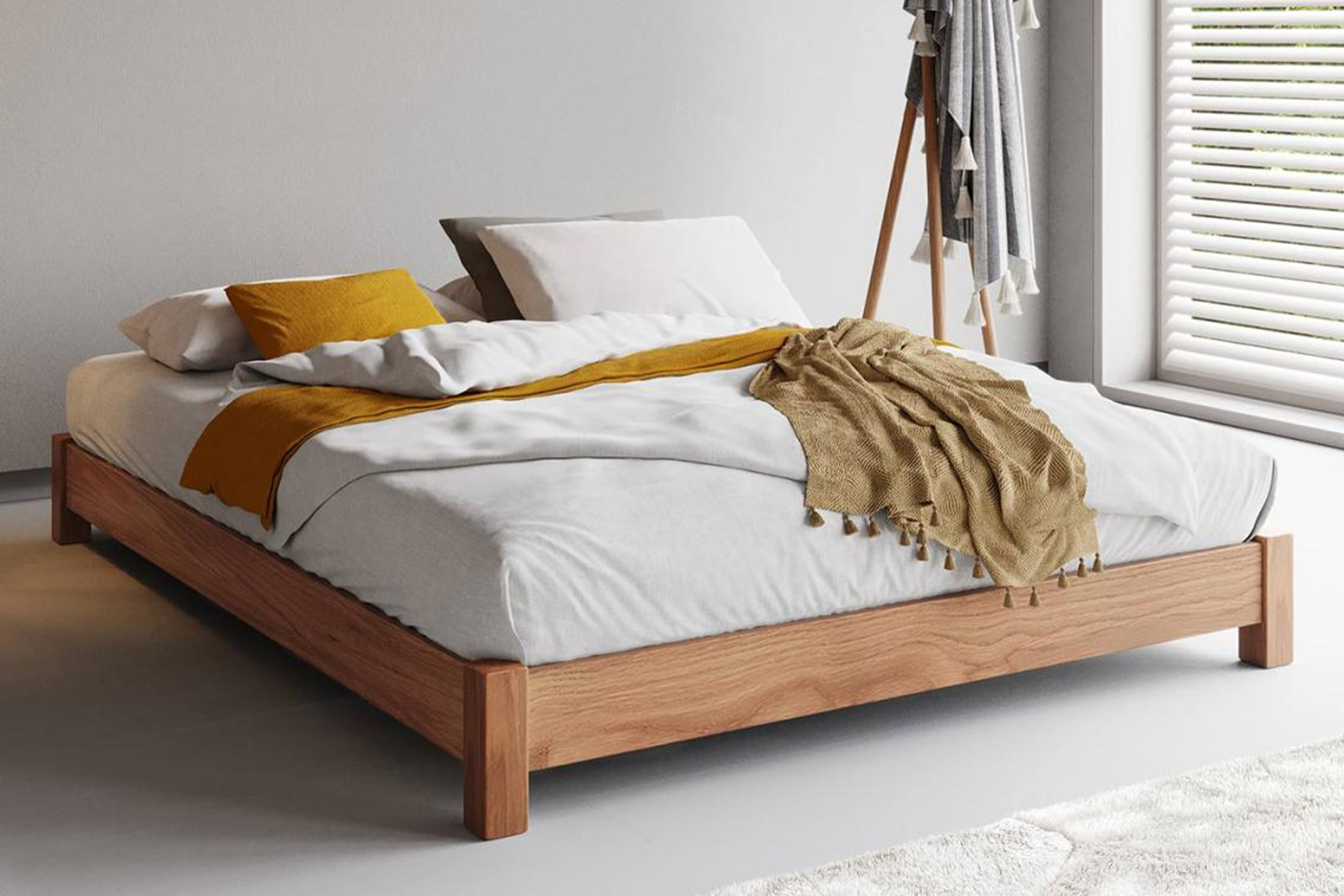 For beds without a headboard, Bee Jayane recommends Get Laid Beds. The low down style is a platform bed frame, which comes in 17 textures across solid pine and hardwood.