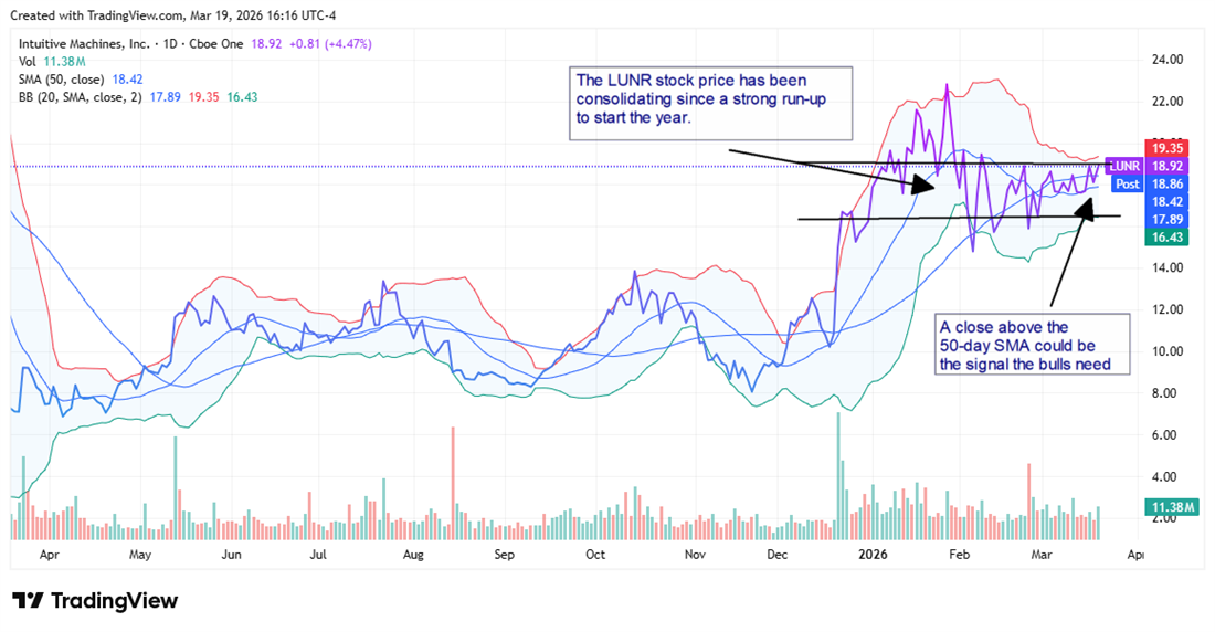 That positioning is the key nuance. A consolidation pattern is present, but the stock is leaning bearish within that range rather than pushing against the upper band. It has to be encouraging for the bulls to see LUNR stock close back above its 50-day SMA.