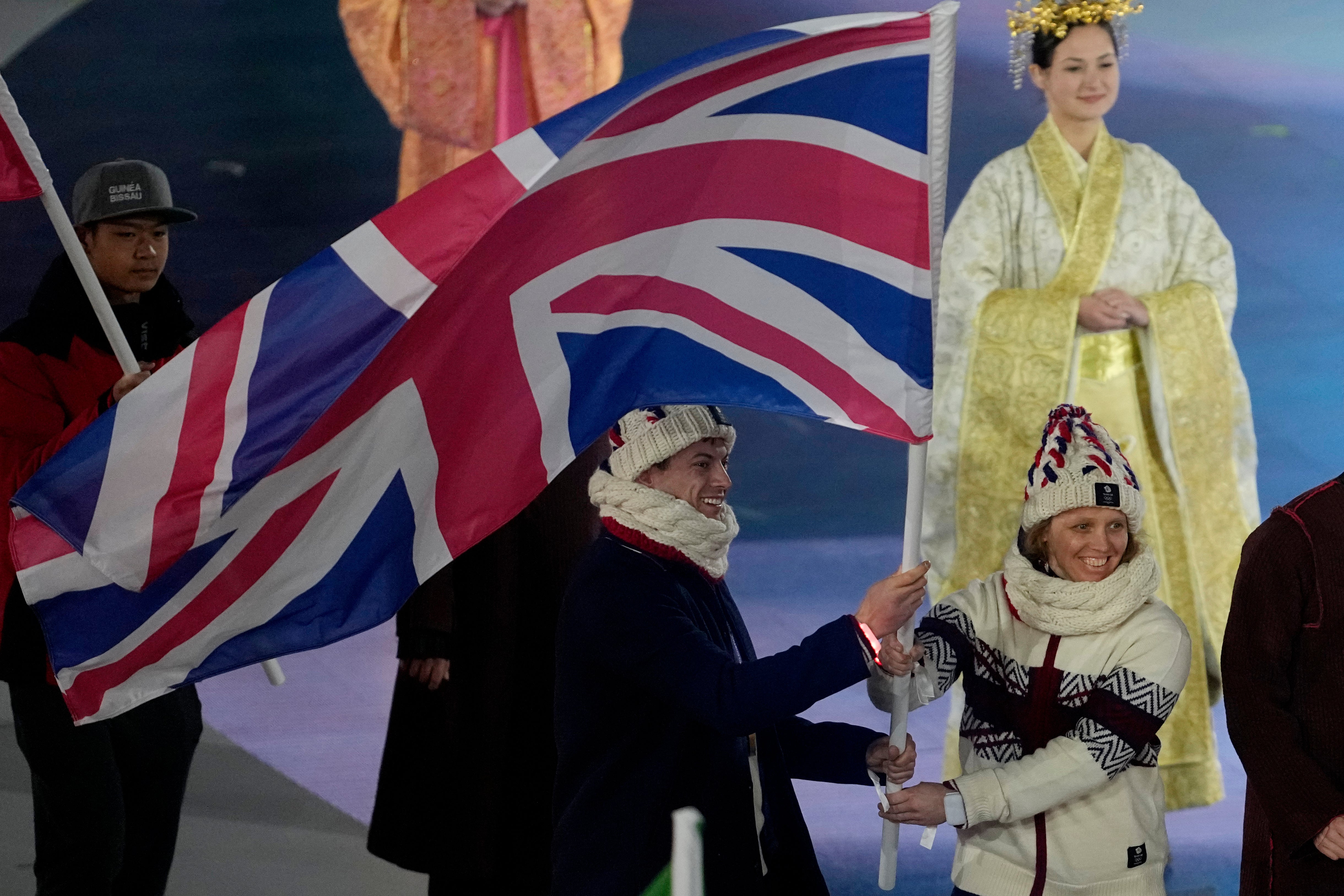 Gold medallists Charlotte Bankes and Matt Weston carried the Union flag at the ceremony, which drew heavily on the region’s historic reputation for arts and beauty.