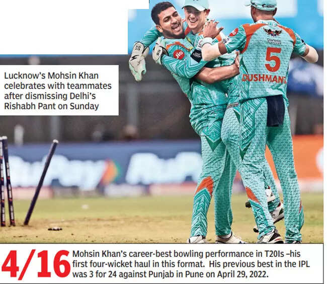LSG management’s eye for talent and the firmly backing unheralded cricketers was underlined by left-arm seamer Mohsin Khan’s return of 4/16. The brisk Mohsin came out with a clear plan for each Capitals batter and implemented it perfectly. He started off by stifling Prithvi Shaw up-front in the chase with short deliveries aimed at his body. He then came back, altered his pace and length to dismiss David Warner, Rishabh Pant, Rovman Powell and Shardul Thakur to take the heart out of Capitals’ batting. Mohsin’s spell would be a lesson for a rather erratic and toothless Capitals seam attack.