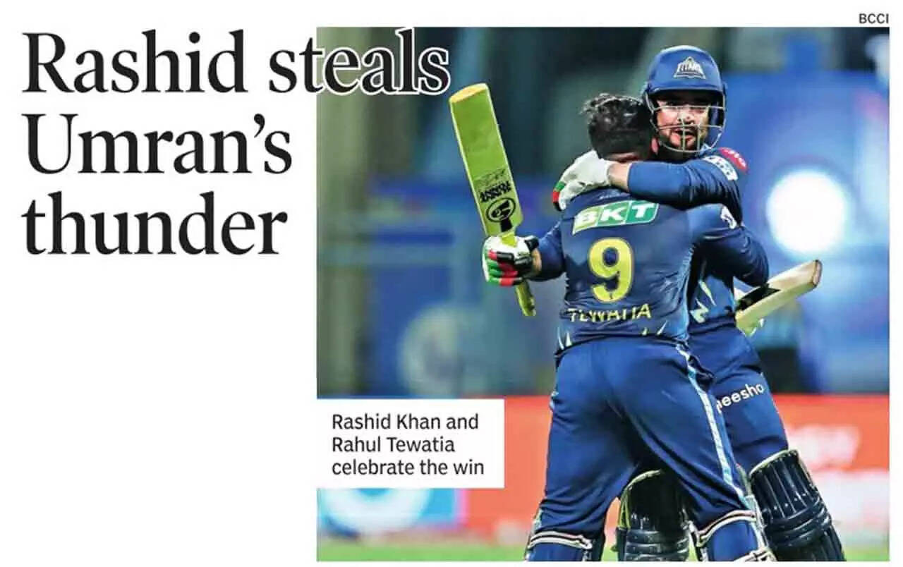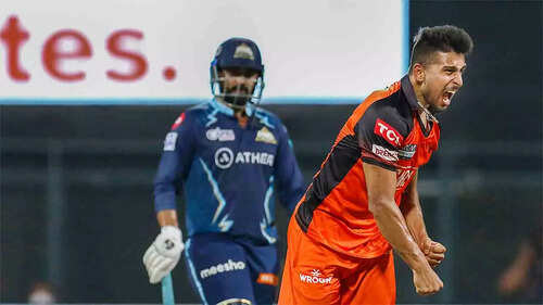The Titans started their chase at a frenetic pace, rattling up 59 without loss in the powerplay and withstood a torrid spell from SRH tearaway Umran Malik (5/25) to finish at 199 for five. Wriddhiman Saha set up the five-wicket win against his former team with his 68 (38b, 4x11, 6x1) and Rashid Khan made up for his poor bowling effort with an unbeaten 31 (11b, 6x4) to finish the match along with Rahul Tewatia (40*, 21b, 4x4, 6x2).