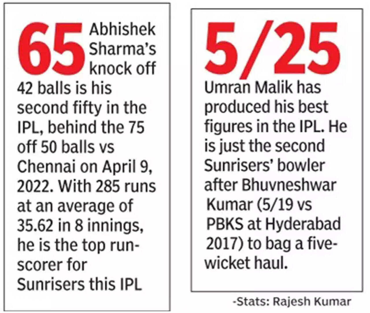 Sunrisers owed their total to Abhishek Sharma's 65 (42b, 4x6, 6x3) and Aiden Markram's 56 (40b, 4x2, 6x3). Abhishek went about his task methodically, while a struggling Williamson was put off his misery by Mohammed Shami.