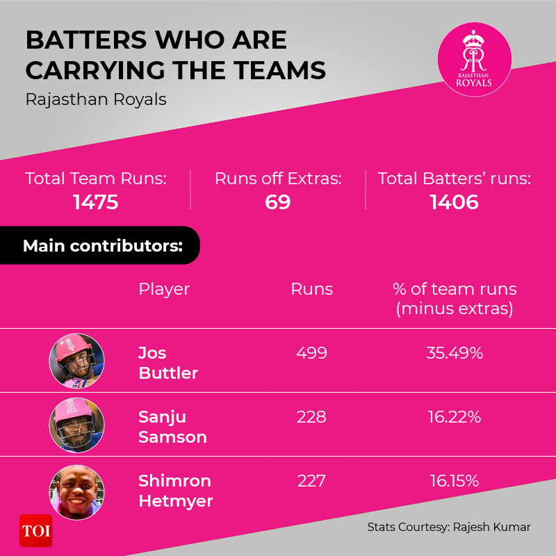 Out of this Butler's share of 499 runs means that he has scored a staggering 35.49% of the Royals runs so far this season. Such has been his dominance with the bat, that the next best after him is captain Sanju Samson, who has so far scored 228 runs - which is 16.22% of the total runs scored off the bat by RR this season, so far. He is followed by West Indian Shimron Hetmyer (227 runs) - who has a 16.15% share in the total number of runs scored off the bat by the Royals, so far.