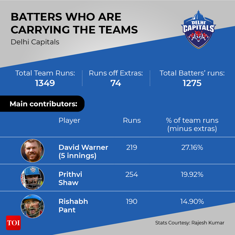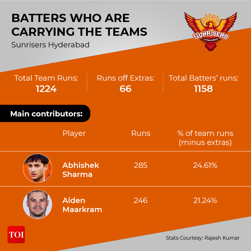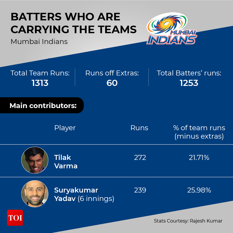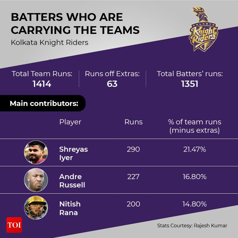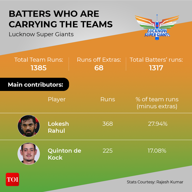 One thing that has stood out in this edition of the IPL, like many more before this, is a trend of a few batsmen doing the bulk of the scoring for their teams. A handful of batters have been carrying the teams, as many big names and young talents continue to struggle with the bat. For many teams, as many as 40%-60% of the runs have been scored between a couple of batters.