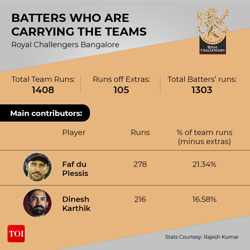 RCB have a new captain this season and he has been leading from the front with the bat. The team which is still looking for their maiden IPL title has so far scored 1408 runs in IPL 2022, of which as many as 105 have been scored off extras. That gives the teams batters a total of 1303 runs.