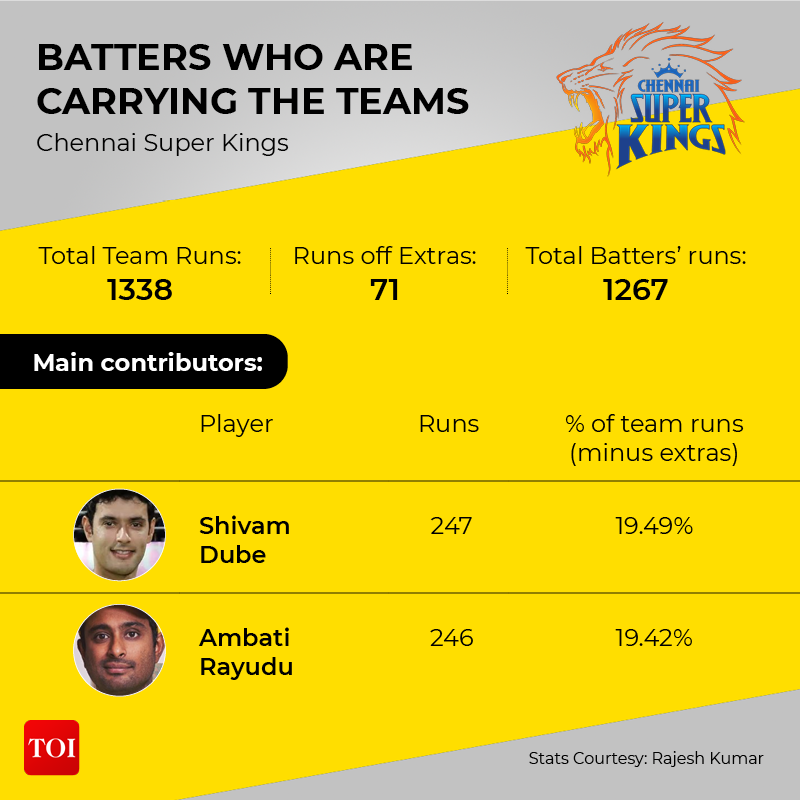 Of these, the two leading run getters and the two main contributors have been Shivam Dube and Ambati Rayudu. Dube, who is 10th currently on the list of highest run getters so far, with two fifties and an average of over 35, has scored 247 runs for a share of 19.49% of his teams runs off the bat, while Rayudu, who has one fifty so far and a highest score of 78, is just one run behind him at 246 for a share of 19.42% of his team's runs in all so far (minus extras).