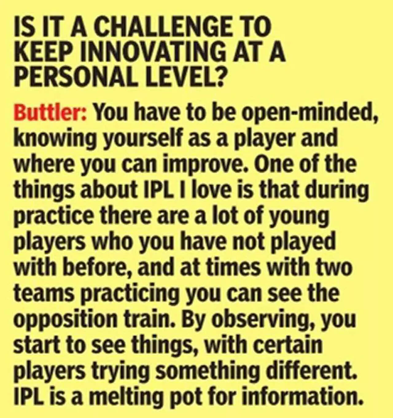 Buttler: You have to be open-minded, knowing yourself as a player and where you can improve. One of the things about IPL I love is that during practice there are a lot of young players who you have not played before, and at times two with teams practicing and you can see the opposition train. By observing, you start to see things with certain players trying something different. IPL is a melting pot for information.