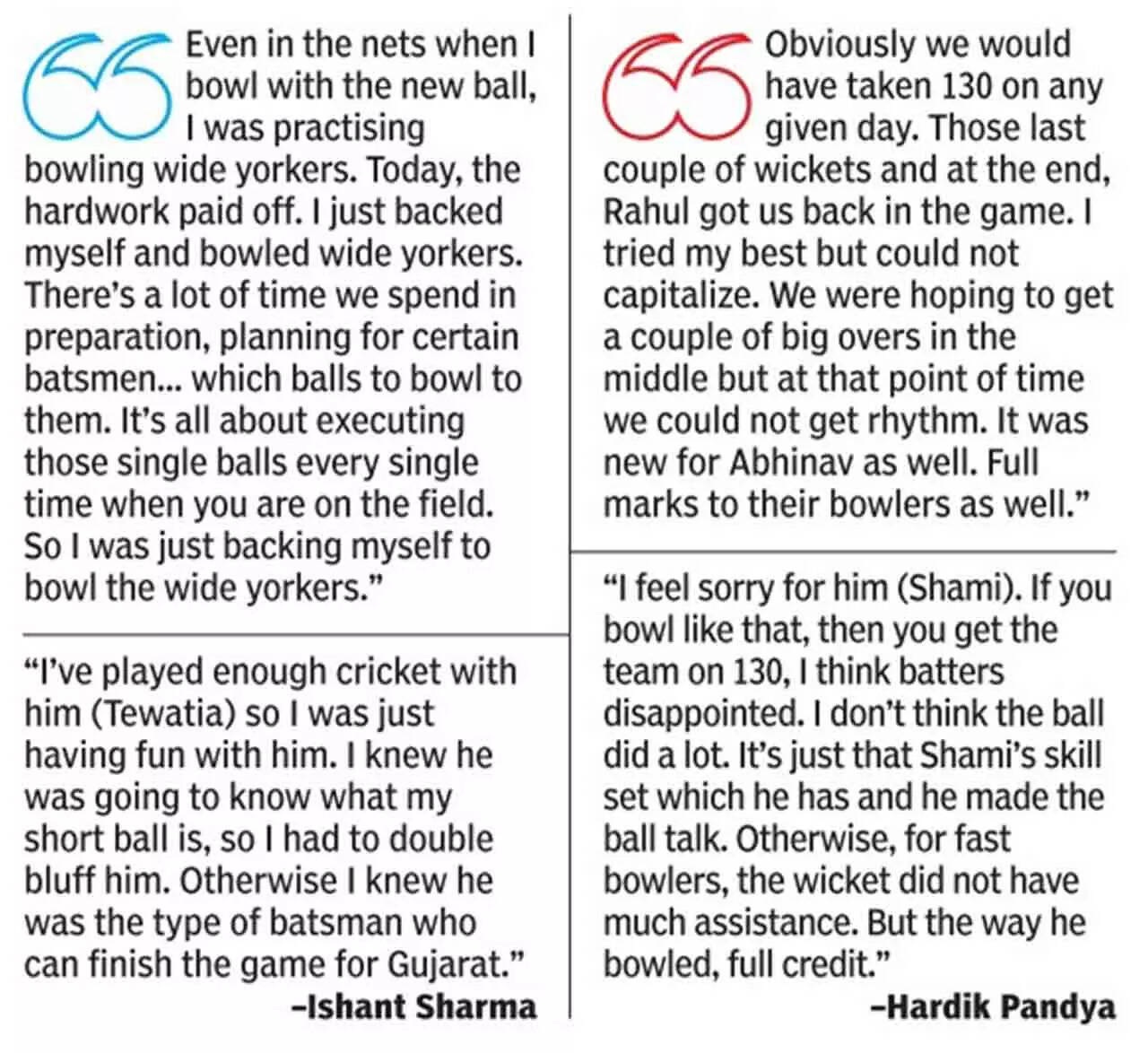 <p>Ishant returned figures of 2/23 and held his nerve in the final over with Gujarat needing 12 to win and falling short. </p>PTIWriddhiman Saha was caught behind off Khaleel Ahmed's away-going delivery while Shubman Gill punched a wide delivery off Nortje to cover. Sharma then foxed Vijay Shankar with a slower delivery as the Titans slumped to 26/3. Miller was bowled by left-arm wrist spinner Kuldeep Yadav for nought. Abhinav Manohar, who made 26 (33b; 1x6), and Pandya put on 62 for the fourth wicket but the laboured stand lacked momentum and the former was caught by Aman Hakim Khan off Ahmed's bowling at long-on. Tewatia's 20 off seven balls this time around wasn't enough and it was too late for Rashid to conjure any magic with the willow.
