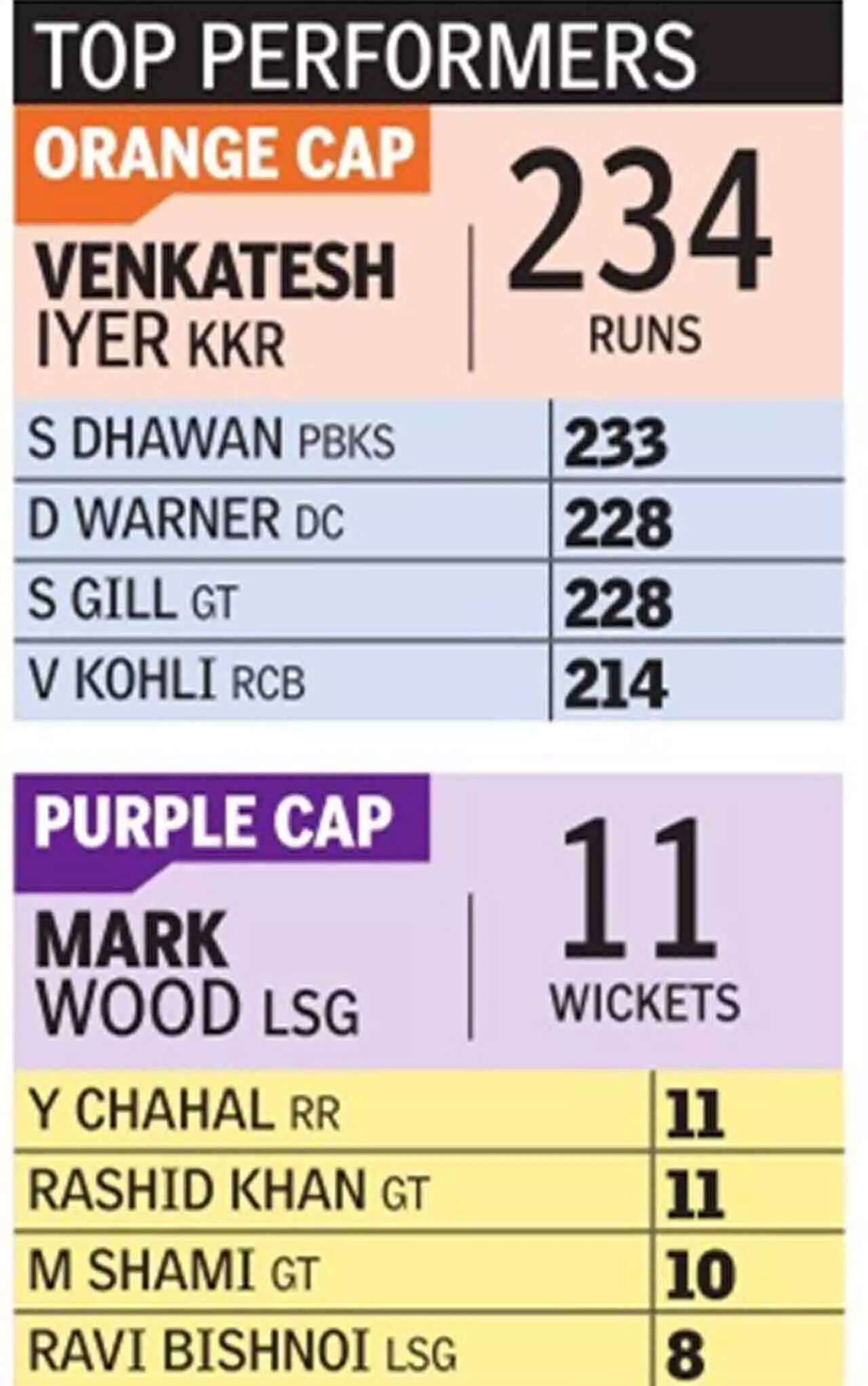 # Three bowlers have bagged eleven wickets in this IPL - Mark Wood (ave 11.81) in four matches; Yuzvendra Chahal (ave 14.27) in five matches and Rashid Khan (ave 15.09) in five matches.