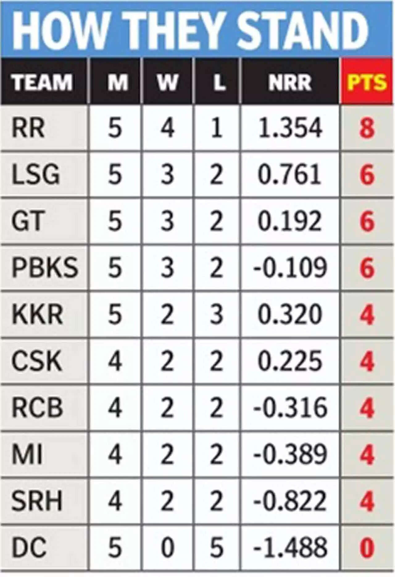 A quick look at the points table also shows just how close the race for the playoffs is this season - Till Monday, April 17, before the RCB vs CSK match, three teams are locked at 6 points each, while as many as 5 teams are on 4 points.