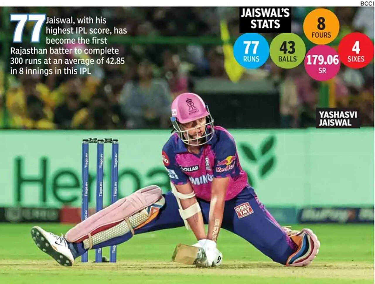 Yashasvi Jaiswal underlined the fact that he is one of the most improved left-handed batters in the country with yet another sparkling knock at the top of the innings. The 21-year-old southpaw smashed 77 off just 43 balls at an impressive strike rate of 180. His attacking innings consisted of eight fours and four towering sixes which helped RR get off to a flying start. It was Jaiswal's third fifty this season.