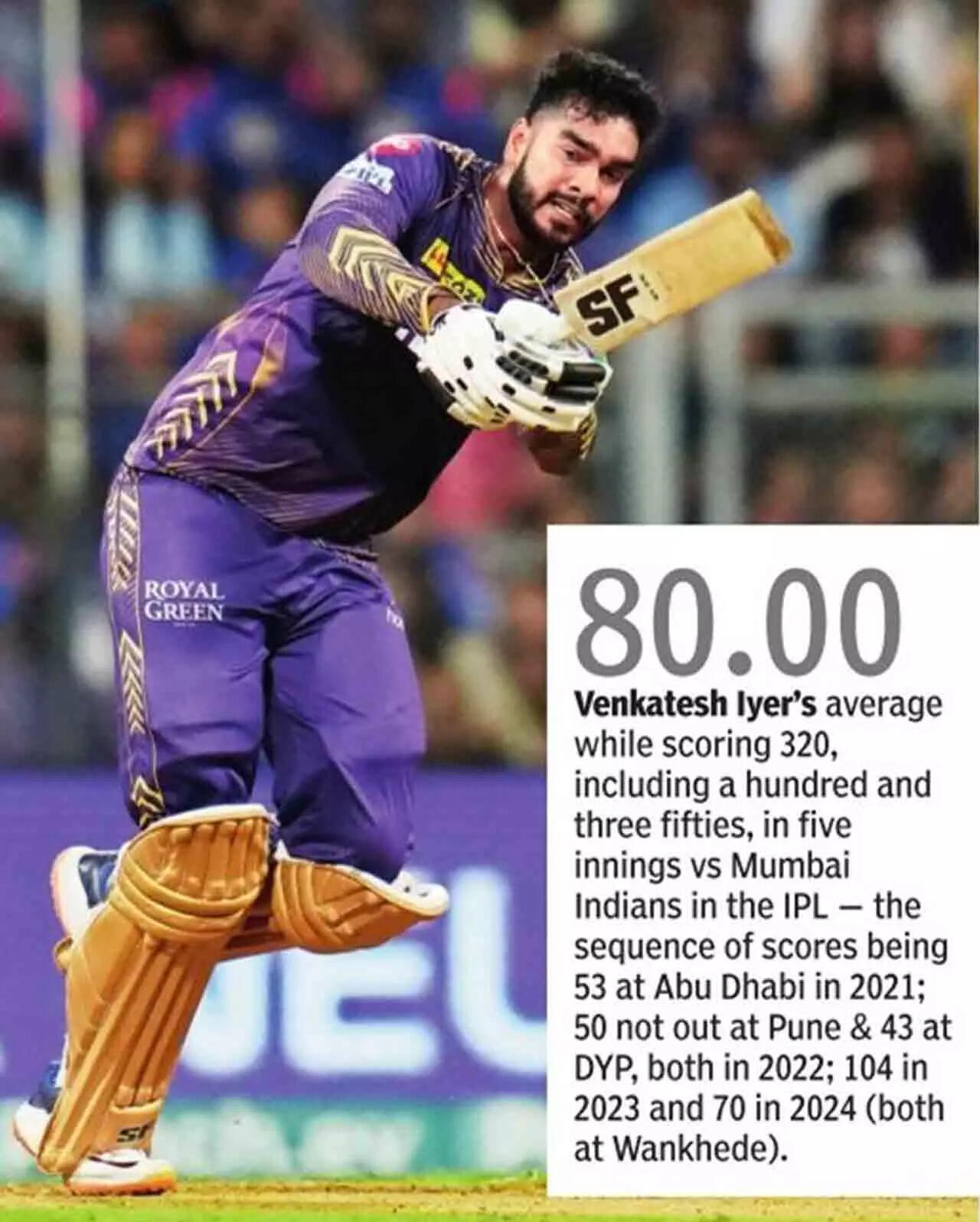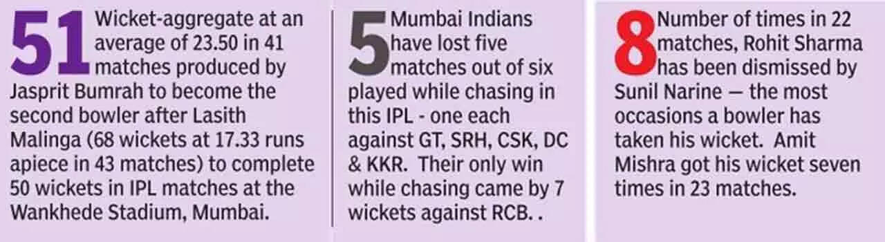 Suryakumar Yadav gave MI a glimmer of hope with his 35-ball 56. He started sedately with wickets falling around him but once the spinners had finished their quota, he opened his shoulders and took on the KKR pacers. He took 20 runs off Vaibhav Arora in the 14th over to bring down the equation to 60 runs from 36 balls.