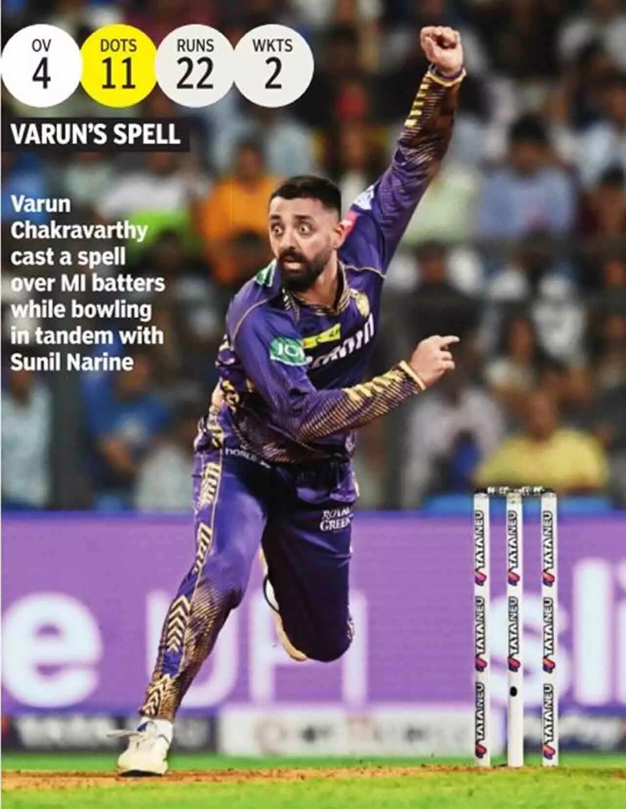 MUMBAI: With the Wankhede Stadium pitch holding up a bit, Kolkata Knight Riders were banking on spin duo of Sunil Narine and Varun Chakravarthy to tame the Mumbai Indians' batters on their home turf.
