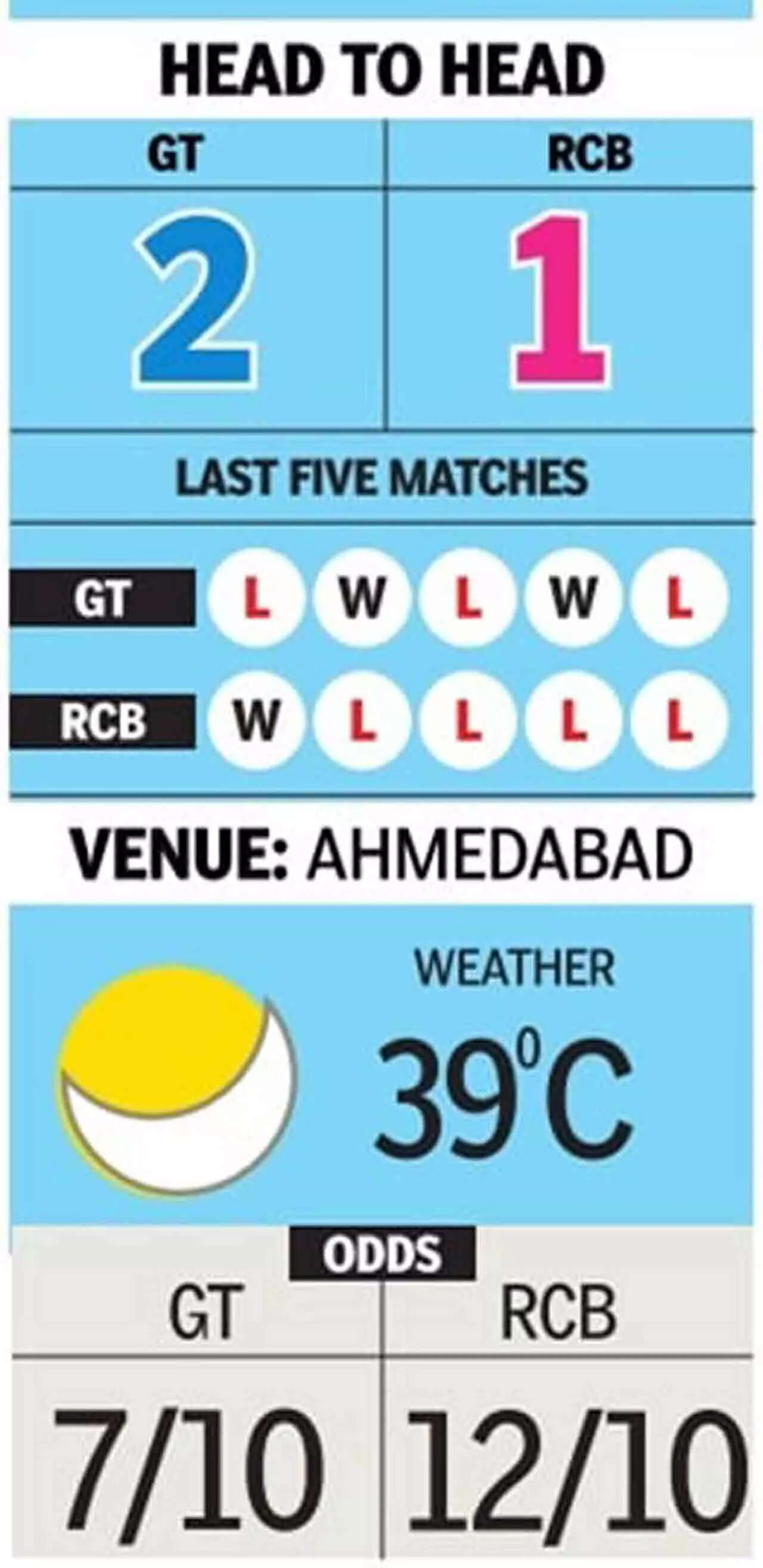 AHMEDABAD: Shubman Gill and Virat Kohli take centrestage as the Gujarat Titans host Royal Challengers Bengaluru in an afternoon match at the Narendra Modi Stadium in Ahmedabad on Sunday.