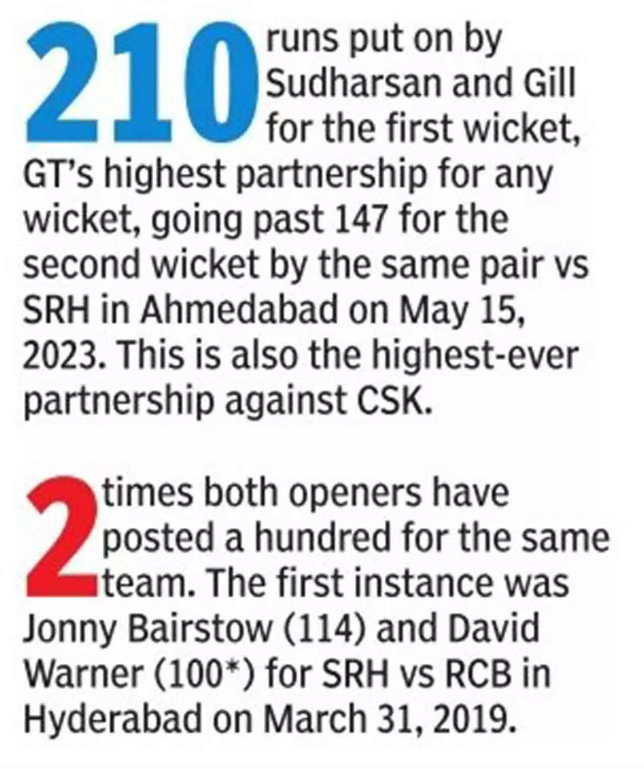 Earlier, the intent and uninhibited strokeplay missing from the Gujarat Titans (GT) during the current IPL campaign was on display. Captain Shubman Gill (104 off 55b; 9x4, 6x6) and fellow opener Sai Sudharsan (103 off 51b; 5x4, 7x6) smashed scintillating tons to equal the highest opening wicket partnership. Sudharsan had missed out on a ton in the IPL final last year, having made 96 not out.