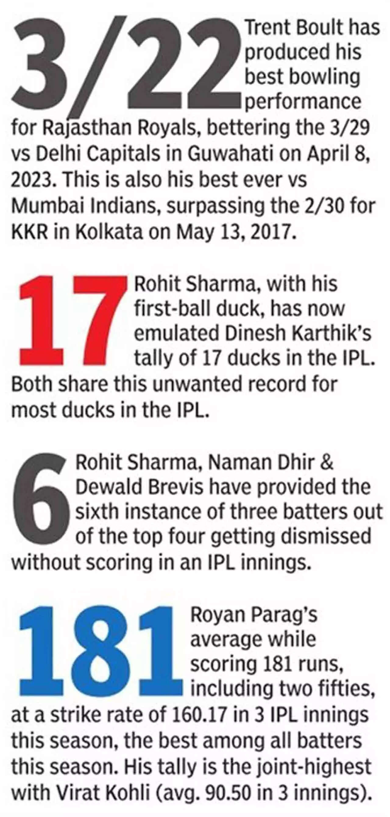 MUMBAI: Smashing Gerald Coetzee for back-to-back sixes over cover and then to mid-wicket, before sealing the chase with a top-edged four, Riyan Parag, following up on his scores of 43, 84 not out, finished with a sizzling 54 not out off 39 balls.