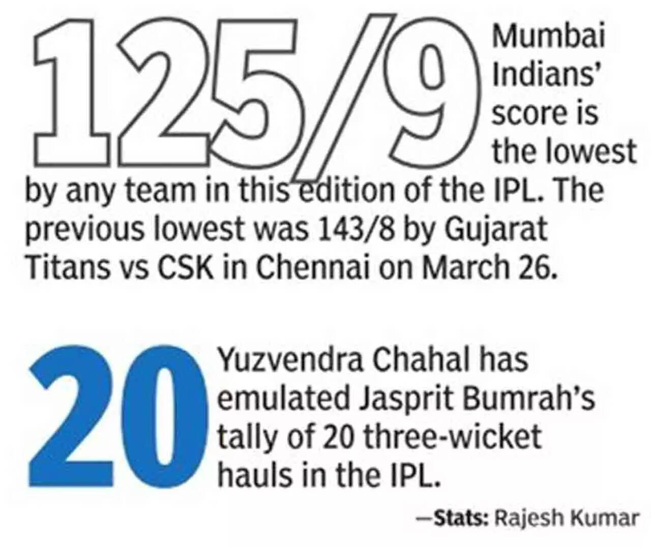 Thriving on a spicy pitch, RR's left-arm pacers Trent Boult (3-22 in four overs) and Nandre Burger (2-32 in four overs) left MI limping at 20 for four in the fourth over, before Yuzvendra Chahal (3-11 in four overs) snuffed the life out of the latter half of the hosts' innings, which was restricted to 125 for nine.