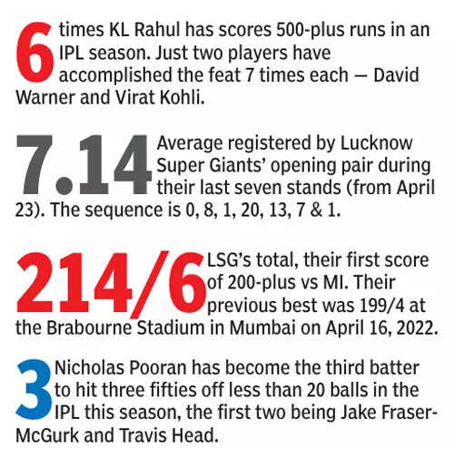 MUMBAI: Nicholas Pooran likes to swing his bat, as hard as he can, from the first ball. Sometimes that high-risk approach comes off in spectacular fashion. Friday was one of those days for the West Indies left-hander as he slayed the Mumbai Indians bowlers during his knock of 75 from 29 balls — laced with five fours and eight sixes — which helped Lucknow Super Giants post 214/6.