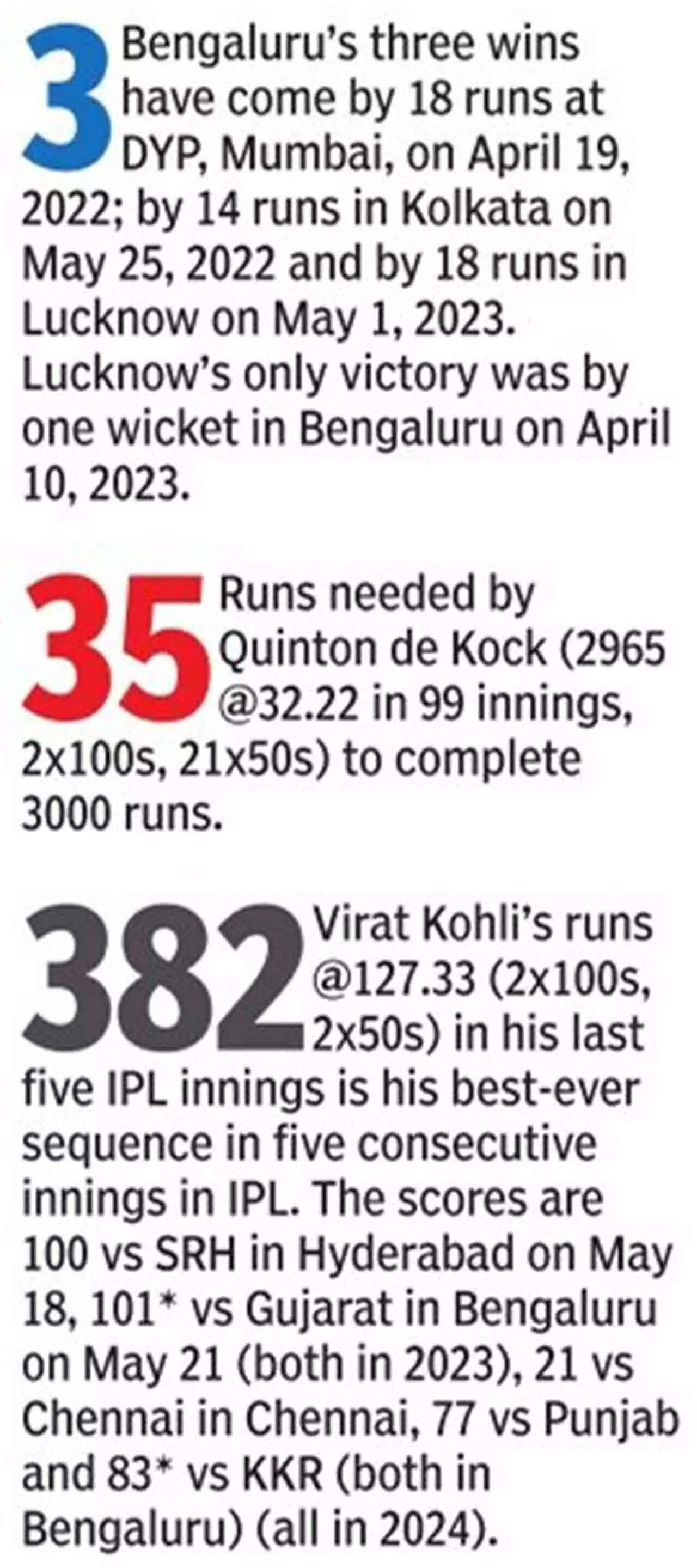 RCB haven't really been able to convert their backyard into a fortress, while LSG have three prominent players who call this venue their home. Top-order batters Rahul, Devdutt Padikkal and off-spinner K Gowtham will look to make the most of the home advantage. This contest will also pit RCB head coach Andy Flower against his former team LSG, who he coached in the previous two seasons.