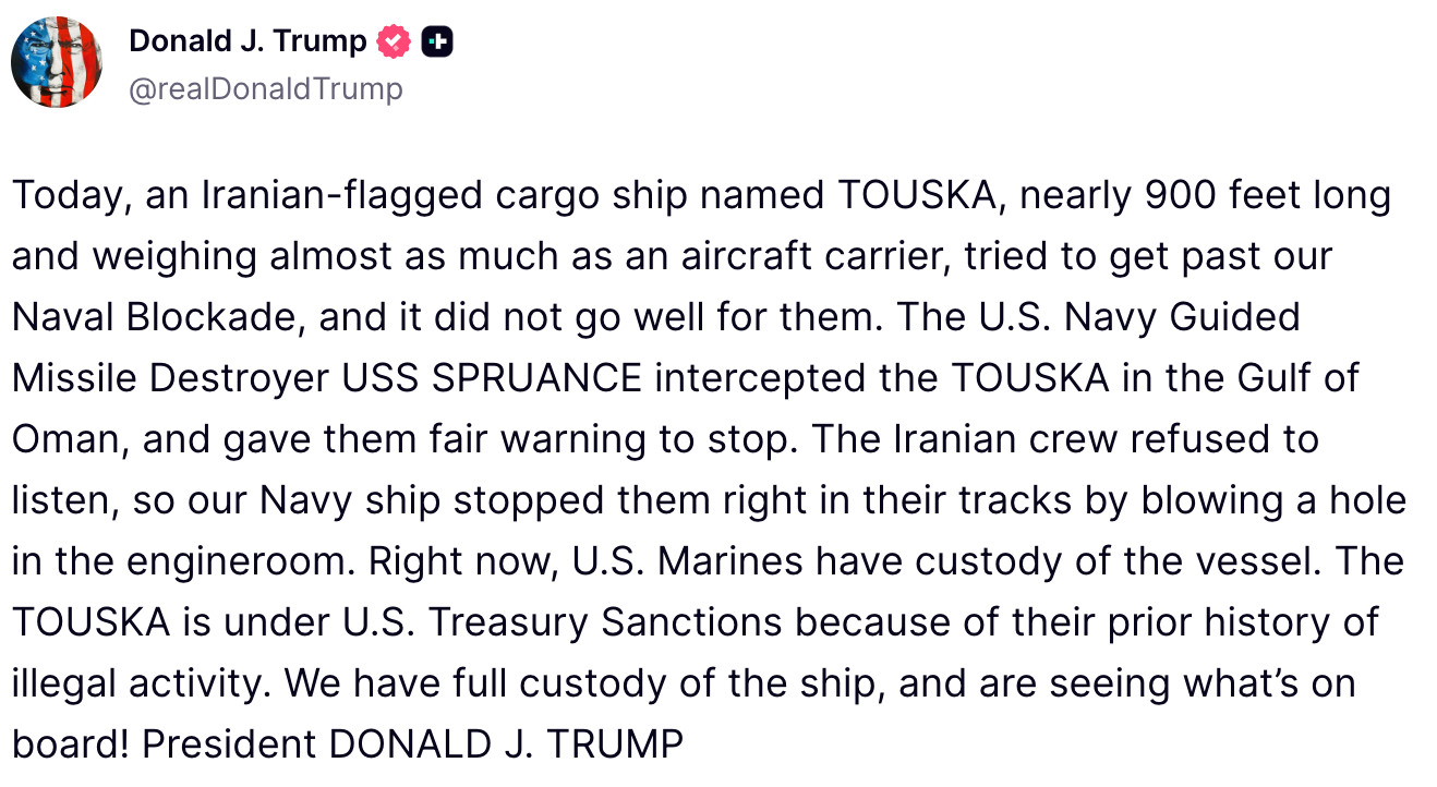 In a post on Truth Social, Mr Trump added: “The Iranian crew refused to listen, so our Navy ship stopped them right in their tracks by blowing a hole in the engineroom.”
