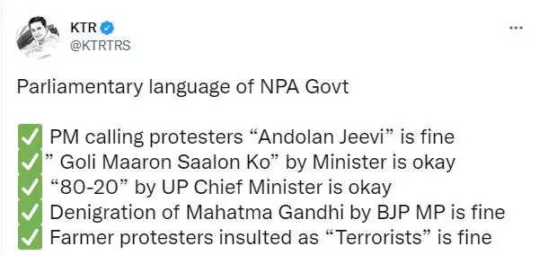 Taking to twitter on Saturday, KTR said "PM calling protesters 'Andolan Jeevi ‘is fine?, `Goli Maaron Saalon Ko’ by a minister is okay, `80-20’ by Uttar Pradesh chief minister is okay?, Denigration of Mahatma Gandhi by a BJP MP is fine? and farmers protesters insulated as terrorists is fine?.”